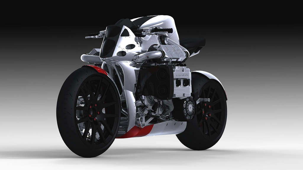 Ia mengawinkan sebongkah mesin Turbocharger Boxer Subaru WRX dengan rangka motor futuristik, dengan swing-arm pincang pada sisi roda depan dan belakang, yang juga dijadikan sebagai poros kemudi.